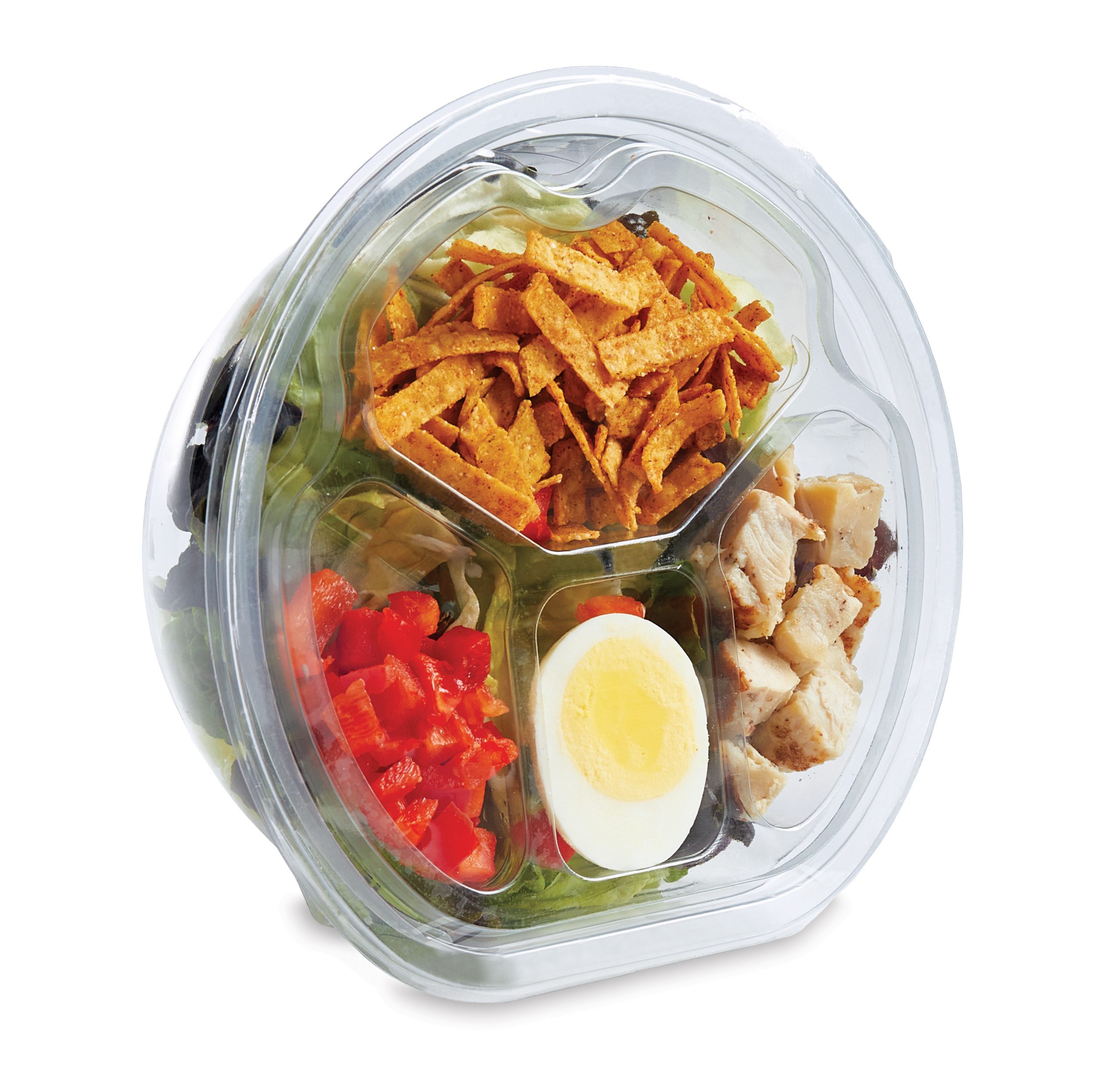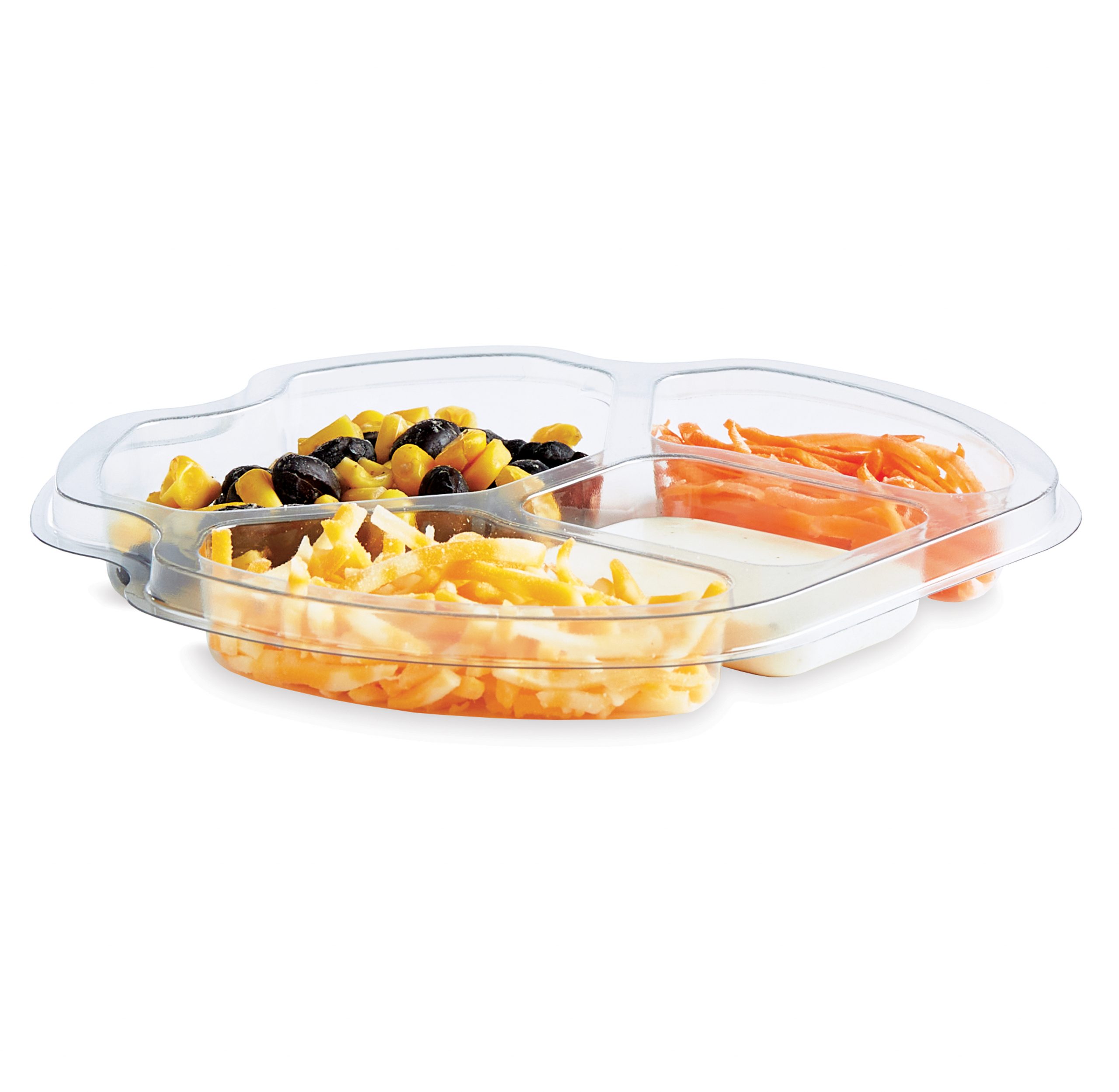 The 4-compartment insert tray is made from our EcoStar post-consumer recycled PET, is completely recyclable, and replaces the unsustainable flexible pouches in regular salad kits.