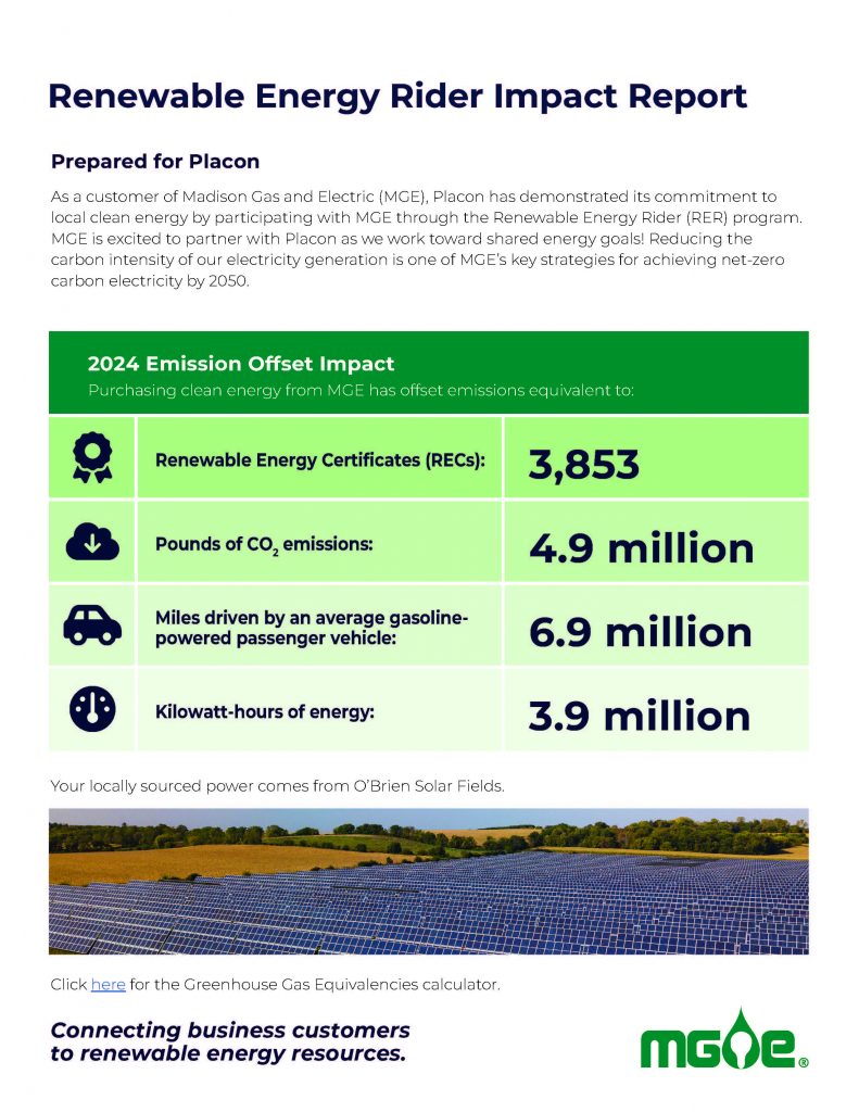 Placon recently received our 2024 Renewable Energy Rider Impact report from Madison Gas & Electric. The report highlights our commitment to locally produced clean energy, which we purchase from the O’Brien Solar Fields, located a few miles from our corporate headquarters in Madison, WI. See below for Placon’s 2024 Emission Offset Impact: