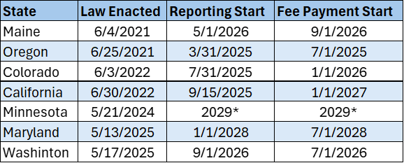 Currently, seven states have EPR laws relating to packaging: Maine, Oregon, Colorado, California, Minnesota, Maryland, and Washington.