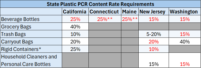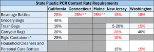 Five States currently have PCR content legislation with the intention of reducing waste, aiding local recycling efforts, and holding producers accountable for what happens to their products after consumer use. This trend continues with several more states having introduced bills in 2025 in relation to PCR and producer responsibility.